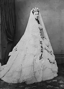 The wedding dress of Princess Alexandra of Denmark (the future Queen Alexandra) was worn at her wedding to Albert Edward, Prince of Wales (King Edward VII from 1901 to 1910) on 10 March 1863 in St George's Chapel, Windsor Castle. It was the first in British royal history to be photographed while being worn. The gown was made by London dressmaker Mrs James of Belgravia.[1] It is now part of the British Royal Collection. In 2011, the dress was part of a display of royal wedding dresses at Kensington Palace.[2]