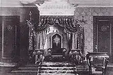 Puyi's role was largely a symbolic one as head of state. The one item of state business he was allowed to control was the construction of a new palace. Two groups within the government put forward different plans. The Mantetsu wanted a modern palace design that integrated itself into the new city of Xinjing (modern day Changchun). The Construction Corps Bureau favoured a south facing palace modelled after the Forbidden City in Beijing.[4] Puyi favoured the latter. The place for the new palace was chosen in the western section of the city, and a different central area was picked for the construction of a temporary palace. The western site was soon abandoned leaving the central site as the main palace. However, with the onset of World War II, resources for construction were diverted. Work on the palace halted in 1943, and as a result the new palace was never completed.[4]