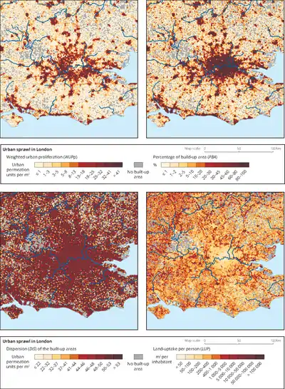 - ↑ Jaeger, J.A.G., Schwick, C. (2014): Improving the measurement of urban sprawl: Weighted urban Proliferation (WUP) and its application to Switzerland. Ecol. Indic. 38: 294-308.
