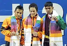 XIX Commonwealth Games-2010 Delhi Winners of 62 Kg Men Weightlifting, Jumitih Arico of Malaysia (Gold), Medal Winner Mahayudin Naharudin of Malaysia (Silver) and Kurukulasooriyage Anton Sudesh Peiris of Sri Lanka (Bronze)