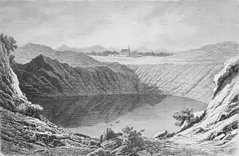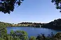 The maar lake was formed about 10,500 years ago by a volcanic steam explosion and is around 525 metres long, 375 metres wide and 51 metres deep. It has a surface area of about 16.8 hectares. The maar lies at a height of 483.5 m above sea level (NHN).[1] The embankment surrounding the lake is made from tuff and is higher in the west and south than in the north and east. Along the course of this bank is the Mäuseberg (561.2 m) and the Maarkreuz (534.5 m). The lake region is now a nature reserve and bathing in the lake is forbidden.[2]