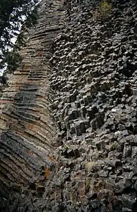At the end of the last ice age approximately 10,000 years ago, massive floods from the melting glacial ice carved deep canyons into the underlying plateau-capping lava flows.[4] Most of these canyons contain rivers such as the Murtle and Clearwater, and waterfalls such as Canim Falls, Moul Falls, Spahats Falls and the 141 m (463 ft) high Helmcken Falls.[4] The faces of the basaltic lava flows and waterfalls remain vertical due to the nature of the basaltic lava flows.[4] Basaltic lava shrinks as it cools and forms vertical columns of rock called columnar basalt.[4] More recently, the southern end of the volcanic field has experienced continuous volcanic activity since the end of the last ice age. This volcanic activity occurred in three areas; Spanish Creek, Ray Lake and Kostal Lake which were followed by lava fountain eruptions creating cinder cones and lava flows.[6]