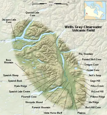 The Wells Gray-Clearwater volcanic field, also called the Clearwater Cone Group,[2] is a potentially active[3] monogenetic volcanic field in east-central British Columbia, Canada, located approximately 130 km (81 mi) north of Kamloops. It is situated in the Cariboo Mountains of the Columbia Mountains and on the Quesnel and Shuswap Highlands. As a monogenetic volcanic field, it is a place with numerous small basaltic volcanoes and extensive lava flows.[4][5]