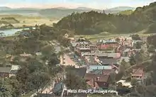 The area was first called Governor's Right because 500 acres (200 ha) were granted to Governor Benning Wentworth of New Hampshire. It was purchased by Er Chamberlin, who built a gristmill on the Wells River.[7] Located at the head of navigation for the Connecticut River, Wells River developed as a center for trade. Canal boats guided by long poles floated downriver laden with lumber, clapboards and shingles, returning with goods such as iron, salt, rum and molasses.[7] In the 1830s and 1840s, Jacob Kent Jr. was the proprietor of the Coosuck House, a well-known Wells River hotel.[8]