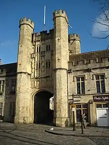 The Bishop's Palace was already surrounded by walls, but in 1286 Bishop Burnell obtained a licence to crenellate, so as to build gated walls around the wider cathedral close and adjacent residential complex of canons;[5] this licence was repeated in 1340 for Bishop Ralph of Shrewsbury.[5][6] The building of the walls is believed to have filled a number of roles, including defending the ecclesiastical territory in a time of hostilities between religious and civic authorities, displaying the authority of the Bishop of Bath and Wells, and possibly also in part as an element in the landscaping of the cathedral close and palace.[5]