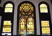 Stained glass windows, including distinctive Star of David round window, at Welsh Presbyterian Church (Los Angeles) in 2007.