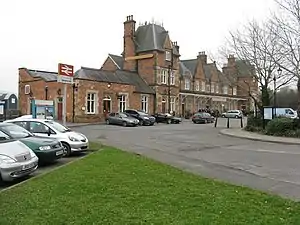 The replacement station platform is reached by a pedestrian bridge crossing both the railway and the A483, with long uncovered inclines to the north and stepped access from the south. There are no facilities beyond a ticket vending machine, small shelter, bench seating, passenger information displays and a customer help point (though the National Rail Enquiries station page does have directions to a local travel agent with National Rail ticketing facilities).[3] The original station building can still be seen across the road, and has been converted into a shop and café.