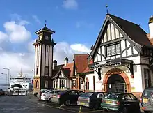 The station was designed by James Miller in 1903 for the Caledonian Railway and is remarkable in its use of glass and steel curves. The station is noted for its architectural qualities and, although one of Scotland's finest railway buildings and Category A listed, it has suffered from neglect. A major refurbishment scheme carried out jointly by Network Rail, Inverclyde Council and the Scottish Government from June 2014 to the spring of 2016 has seen the station buildings and adjacent ferry terminal fully restored.[7][8]