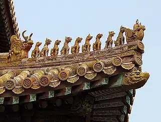 Wenshou, also called zoomorphic ornaments, are figurines or statues of various animals, both mythological and real. The animals featured in wenshou have significant symbolism within the Chinese culture and Buddhist religion. These traditional decorative elements are most commonly featured on roofs of imperial structures, the most prominent example being the Hall of Supreme Harmony in the Forbidden City in what is today the Dongcheng District in Beijing, China. [1]