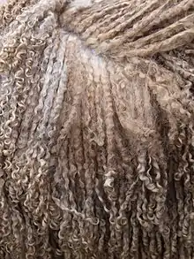 The Wensleydale is a British breed of domestic sheep.[1][2] It is named for the Wensleydale region of North Yorkshire, in the north of England, where it was bred in the early nineteenth century by cross-breeding a Dishley Leicester ram with local long-woolled sheep of a breed that is now extinct.[3] It has a blue-grey face and long purled wool, and is among the heaviest of British sheep breeds. It is an endangered breed, and is categorised as "at risk" by the Rare Breeds Survival Trust.[3] It is often used as a ram breed to cross with other breeds to obtain market lambs, and for its high-quality wool.[3]