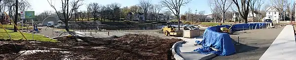 Phase III ran almost concurrently with Phase II, starting in 2008[26] but carrying on into 2009, at a cost of $850,000.[27] This part of the overall project included a new 'tot' playground, improved accessible pathways with lighting, landscaping, inducing tree planting, and restoration of the park's bandshell itself[28] which has been an important landmark in the area for generations.[25] A floating fountain, lit up at night, was placed in the bandshell pond. A new entry arch was created by Cape Breton artist Gordon Kennedy and installed at the intersection of Byng and Bentinck Streets. Kennedy also created artistic stands for interpretive story boards to explain the park's history.[27][2]