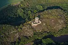 The ruins of the hill castle are situated above the River Nette at the foot of the Eifel mountains in the immediate vicinity of the Plaidt junction on the A 61 motorway. In the eastern part of the hill spur, on the narrowest part of which the castle was built, there was a Roman fortification in the Late Antiquity. The origin of this defensive position, which was probably conceived as a refuge fort, has been dated by coin finds to the first half of the 4th century. On the basis of pottery finds, it is assumed that the fort was used until the early 5th century.[1]:53 Similar sites from the Late Antiquity along the Nette are found at Welling, Ruitsch and on the Katzenberg near Mayen.