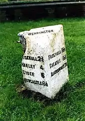 - ↑ Historic England, "Stone post at SJ 9342 4781, Werrington (1037910)", National Heritage List for England, retrieved 30 January 2020