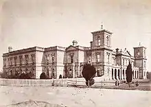 The beginnings of Wesley College came from a decision of the colonial government of Victoria in the wake of the Victorian gold rush to grant land and funds to four religious groups, including the Wesleyan Methodist Church, for the purpose of establishing colleges in Melbourne.[24][25] In 1854, the government offered the Wesleyans 10 acres (40,000 m2) facing St Kilda Road.[26] Major benefactor Walter Powell encouraged other Wesleyan Methodists to bridge the gap in funds between the government grant and that required to build the school. Daniel Draper and others subsequently contributed sufficient funds. The foundation stone was laid at the present site of the St Kilda Road campus on 4 January 1865. Draper drowned at sea on the day of the school's official opening on 11 January 1866.[2] The first student, Frederick Binks, arrived on 18 January.[27]