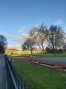 The St Kilda Road campus was substantially rebuilt and expanded between 1933 and 1939 following a bequest from philanthropists Alfred and George Nicholas.[35] The gift of around £200,000 ($16 million in 2008)[36] funded twin double-storey buildings, science laboratories, a Junior School building, swimming pool, gymnasium, chapel and other facilities.[37] In 1942 the Australian Government requisitioned the school's campus for the Australian Army,[38] resulting in Wesley being accommodated at Scotch College from 1942 to 1943. The college was running out of space at St Kilda Road and as early as 1937 had secured an option to purchase the land and buildings of Box Hill Grammar School (now Kingswood College).[39] Headmaster Neil MacNeil advanced this option, opening negotiations in 1946.[40] Commercial agreement was reached in 1947 following McNeil's death in office but was never acted on and finally abandoned in 1955.[41]