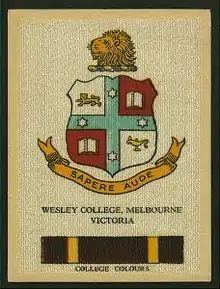 A cigarette card featuring the Wesley College's colours and crest (c.1920s)