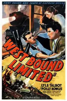 West Bound Limited is a 1937 American action film directed by Ford Beebe and starring Lyle Talbot, Polly Rowles, Frank Reicher, Henry Brandon, Henry Hunter and William Lundigan. Written by Maurice Geraghty, the film was released on July 11, 1937, by Universal Pictures.[1][2][3] The film was recorded at various locations along the South Pacific Coast Railroad in Santa Cruz County, California.