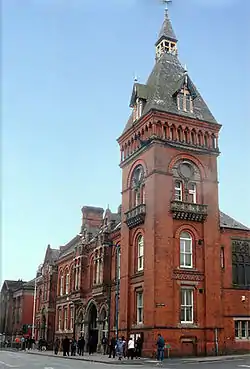 The town hall was commissioned at the instigation of the West Bromwich Town Improvement Commissioners, chaired by Reuben Farley.[2][3] The site selected, known as the Lodge Estate, located on West Bromwich Heath, was purchased from the descendants of William Izon, a local iron-founder.[4] The building, which was designed by Alexander & Henman of Stockton-on-Tees in the Italian Gothic style, was built in brick and stone by Trow & Sons of Wednesbury between 1874 and 1875.[4] The existing reading room was converted into an enlarged council chamber in 1924 and the building was extended to create a new reading room at that time.[5]
