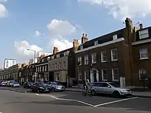 On the south side of the road at its far eastern end, there is a series of houses, built in the mid-18th to early 19th centuries, and all Grade II listed.[1]