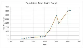 Over the last 200 years the population of West Parley has changed dramatically, In 1801 the population of West Parley was 180, since then the population has mainly increased, the total population decreased three times since then, once where the population went from 180 in 1801 to 175 in 1811. The second time went from 336 in 1881 to 334 in 1891, the largest increases were during the Baby Boom from 1921 to 1951, this was when everyone was procreating tenfold due to welfare benefits and due to lower income jobs. From 1921 to 1931 the population rose from 1,130 to 1,671 and then from 1931 to 1951 the population rose to a huge 2,947, this may also be due to the fact that children were also moved to small areas in the countryside and this can also account for the drop to 2,002 people in 1961.[7]