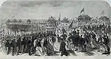 The West Pier was constructed during a boom in pleasure pier building in the 1860s, during which 22 new piers were erected across Britain.[3] It was designed by architect Eugenius Birch as a place for seaside visitors to enjoy fresh sea air.[4] Some wealthy residents in the nearby Regency Square objected to construction, complaining that the planned toll houses at the entrance would spoil the view of the sea from their homes. It was felt that the pier would have a positive effect on property values in the town, so the pier was approved.[5] Construction began in 1863 and the pier opened to the public on 6 October 1866.[3]