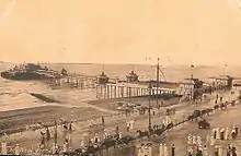 The pier's length was 1,115 feet (340 m) with a width of 310 feet (94 m) at the pierhead.[6] It was built with cast iron threaded columns screwed into the seabed.[7] The superstructure's ironwork was manufactured by Robert Laidlaw, featuring an "oriental" style. By the opening, the pier was fitted with gas lamps with ornamental serpent designs, which had been directly influenced by similar examples inside the nearby Royal Pavilion.[3] The pier had ornamental houses, two toll houses and glass screens at the pierhead to protect visitors from the weather.[8] A New Scientist report covering Britain's piers called the pier Birch's "masterpiece".[9]