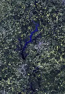 West Point Lake is a man-made reservoir located mostly in west-central Georgia on the Chattahoochee River and maintained by the U.S. Army Corps of Engineers (USACE). The Chattahoochee river flows in from the north, before flowing through the West Point Dam, which impounds the lake, and continuing to Columbus, Georgia. Of the four major USACE lakes in the ACF River Basin, West Point Lake is the smallest by area containing 25,864 acres (10,467 ha) of water, and has the second shortest shoreline at 604 mi (972 km).[7] The purposes of the reservoir are to provide flood control, hydroelectric power, and water storage to aid the navigation of the lower Chattahoochee.