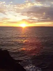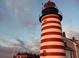West Quoddy Head, in Quoddy Head State Park, Lubec, Maine, is the easternmost point of the contiguous United States.[2][3][4] In 1808 a lighthouse was constructed at the site to guide ships through the Quoddy Narrows. The current tower, with distinctive red-and-white stripes, was constructed in 1858 and is an active aid to navigation. The 3rd order Fresnel lens is the only 3rd order and one of only eight Fresnel lenses still in use on the Maine Coast.[5]