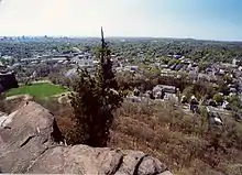 West Rock Ridge is popular for recreation and known for its microclimate ecosystems, rare plant communities, and expansive views from cliffs that tower up to 500 feet (152 m) above the surrounding landscape.[1][2] The ridge is traversed by a network of hiking trails including the 7-mile (11 km) Regicides Trail, whose northern terminus begins as a spur off the 21-mile (34 km) Quinnipiac Trail.[3]