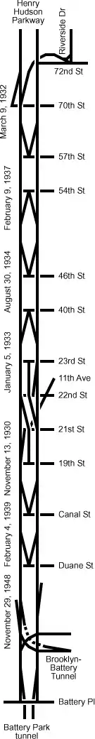 - ↑ "City Opens Underpass at Battery, $10,000,000 Link in Express Route: New Battery Park Underpass Opens". The New York Times. April 11, 1951. ISSN 0362-4331. Retrieved September 12, 2017.