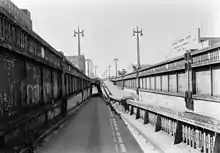 The highway was indefinitely closed south of 18th Street.[58] The northbound lanes were also closed from 18th to 48th Street, while southbound traffic between 42nd Street and 18th Street was reduced to one lane.[60] Eventually inspections revealed that the highway south of 46th Street was not structurally sound, and had to be closed to vehicular traffic. The ramps to/from 46th Street were configured as the temporary southern terminal for northbound traffic on the highway, and the ramps to/from 57th Street were configured as the temporary southern terminal for southbound traffic. The segment north of 57th Street carried traffic over the Penn Central Rail yards, and could not be closed as there were no surface streets on which to reroute traffic. This section of Miller Highway remained in use into the 1980s, and has been since rebuilt.