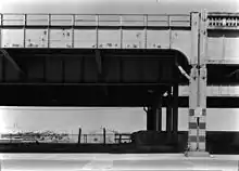 Primarily, the Miller Highway consisted of six lanes, supported above the street level on steel columns, which were located at regular intervals (~80 feet) at the outer edges and center of the roadway. Longitudinal strength girders ran between the support columns along the direction of the roadway. The longitudinal girders supported the industrial looking balustrades and the median. Lateral strength girders ran between the support columns across the roadway, and was the location of the expansion joints. Smaller longitudinal and transverse floorbeams formed a lattice structure between major girders to support the road deck. The road deck consisted of reinforced concrete, on top of which the paved surface would sit. Originally this was Belgian block, and was eventually substituted or paved over with asphalt as construction materials matured.[23] Drainage was provided at the expansion joints (on the older sections) or grated channels along the edge of the road (newest sections), with rainwater and snowmelt being plumbed to the street through scuppers and downspouts located at the main support columns. It was not uncommon during the life of the highway that it would be supporting not only traffic, but 6 to 8 inches of standing water. The high impermeable balustrades, the undersized scuppers, the use of salt to de-ice the highway, and the lack of drain cleaning / maintenance were all ingredients which contributed to the structure's demise.[24][25]