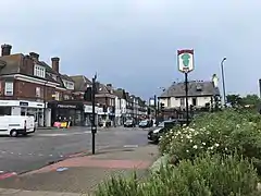 Until the 1900s West Wickham remained a small village. The inter-war period saw rapid development and the transformation of the area into a suburb of London, facilitated by the arrival of the railway station, which opened in 1882.[4] Much of the formerly extensive West Wickham Common was built over, though a small tract was purchased and preserved by the Corporation of London in 1892.[4] At the crossroads by the Swan pub formerly stood the Stocks Tree, a large elm tree so named as it lay behind the village stocks. It was damaged during the laying down of sewerage pipes in the 1930s and was moved to Blake Recreation Ground in 1935, but later blew down in a storm.[5] The tree is commemorated in the village sign and a plaque, both of which stand outside the library, with a piece of the tree on display inside.[5]
