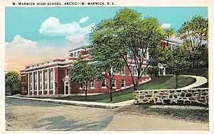 One of the most significant buildings in Westcott is the former Warwick High School. Built from 1904 to 1905, this Neo-Classical structure served as Warwick's high school until West Warwick split off from Warwick in 1913, where it then became West Warwick's high school.[3] Robert Bryon Treat, a member of the Warwick High School Commission, as well as the owner of the Centerville Mill, played an instrumental part in getting the original Warwick school built.[5]