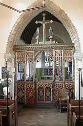 There is archaeological evidence that by at least the 11th century there was an Anglo-Saxon stone church at Westcott Barton, which was originally dedicated to St Edmund the Martyr. In the 11th century the nave was extended westwards and in about the middle of the 12th century the south aisle was added. It has a two-bay arcade and a tomb recess,[2] both of which are Norman.[3] The chancel arch is in a transitional style from Norman to Early English.[4] The church's dedication was changed from St Edmund to St Edward the Confessor in 1238.[5] In the 14th and 15th centuries the chancel and north wall of the nave were rebuilt, the west tower and battlemented south porch were built[2] and the wooden rood screen was installed, all in Perpendicular Gothic style.[3] However, in about 1520 the chancel was reported to be in ruins.[2]