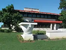 The Westcott House is a Frank Lloyd Wright-designed Prairie Style house in Springfield, Ohio. The house was built in 1908 for Mr. Burton J. Westcott, his wife Orpha, and their family. The Westcott property is the only Prairie style house designed by Wright in the state of Ohio. The grounds include the main house and a garage with stables connected by an extensive pergola.