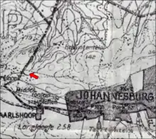 Westdene was originally part of the farm Braamfontein, established in the area in 1853. The farm stretched from Westdene in the west to Houghton in the east and from Newtown in the south to Linden in the north.[2] Various parts of the farm were sub-divided and sold many times over and in 1871 Gerhardus Petrus Bezuidenhout sold his south-western portion of the farm to Frans Johannes van Dijk who in turn sold the land to Johannes Jacobus Lindeque in 1884. The portion of land became known as Lindeque's Portion and would eventually develop into the present-day suburbs of Auckland Park, Cottesloe and Westdene. Hendrik Wilhelm Struben obtained permission from Lindeque to prospect the area for gold in 1885 but no evidence of gold was discovered.[3][4] In 1887 Lindeque sold a portion to the then Zuid-Afrikaansche Republiek for 4000 pounds. The government's intention with acquiring the land was to improve the water supply to Johannesburg, but soon the government also laid out the first suburbs on the farm in 1888 and 1889.[5]