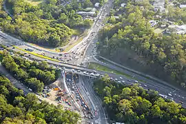 | Aerial view of Moggill Road and Western Freeway Interchange Upgrade. The regular traffic congestion on the Western Freeway is visible. | |