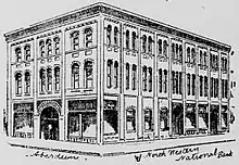 The Northwestern National Bank formed in Aberdeen in 1888 with Henry Marple as president.[2][3][4] In August 1888, the bank purchased the property and general store at 21–23 South Main Street to build a new bank building.[5] Construction took place from 1888 through 1889[6][lower-alpha 1] with the bank opening in the new location in February 1889.[8] In May 1891, a fire damaged the building and gutted the Kearney and Boyer grocery store.[9] In March 1903, another fire damaged the building, originating in the basement banana room of the Gamble & Robinson grocery store.[10]