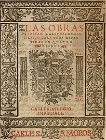 Cover of The works of Boscán and Garcilaso de la Vega in 4 books, published in 1543 - The first Book of Common Prayer, published on January 15, 1549, after being accepted by the House of Lords.[11] The book, due to the political and authoritative changes of the time of the reformation, attempted to provide a "compromise" between Protestant and Roman Catholic beliefs.[11] The author of the book, Thomas Cranmer, assisted in creating a standard version of the modern English language.[12]