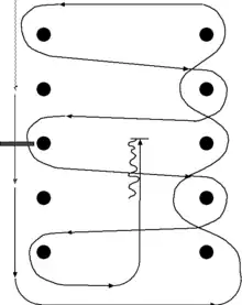 Western Riding is a competitive event at American horse shows, particularly those for stock horse breeds such as the American Quarter Horse. It is not to be confused with the general term "western riding," referring to the many forms of equestrianism where riders use a western saddle; instead, it refers to a particular class where the horse and rider complete a pattern that incorporates elements of both reining and trail classes, but requiring horses to perform in a quiet style akin to that of a Western pleasure class. Horses are evaluated on “quality of gaits, lead changes at the lope, response to the rider, manners and disposition."[1] While all three gaits are required, most of the pattern is performed at a lope. Emphasis is placed on the horse's smoothness, even cadence, and precise, clean flying lead changes.