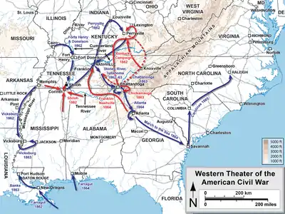The western theater of the American Civil War encompassed major military operations in the states of Alabama, Georgia, Florida, Mississippi, North Carolina, Kentucky, South Carolina and Tennessee, as well as Louisiana east of the Mississippi River. Operations on the coasts of these states, except for Mobile Bay, are considered part of the Lower Seaboard Theater.[1] Most other operations east of the Appalachian Mountains are part of the eastern theater. Operations west of the Mississippi River took place in the trans-Mississippi theater.