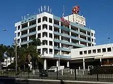 In early 2009, Sutherland Council approved plans to further upgrade the complex, which included demolition of the office tower and adding 100 additional speciality shops at a cost of $435 million. Myer lost its ground floor for a larger 'full-line' Woolworths supermarket.[17] The entrance has moved closer to the Kingsway and the centre expanded by approximately 19,000 square metres to 127,000 square metres of gross lettable area. Demolition of the areas around the office tower began in July 2013.[18] The star which sat on top of the tower was knocked off in late July 2013 as the office tower it sat upon was demolished. This caused anger amongst locals who wanted the star saved and incorporated into the new development.[19][20][17] However the fig tree located outside the centre on Kingsway was saved and incorporated into the development. This development did feature a new facade above the centre which is made up of grey wall which is designed to resemble fish scales in homage to "the Sutherland Shire's beach culture".[21]