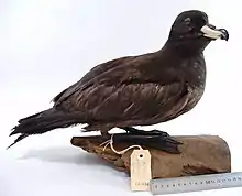 The Westland petrel was first described by New Zealand ornithologist Robert Falla in 1946 under the name Procellana parkinsoni westlandica.[4] The Westland petrel was identified in 1945 after the students of Barrytown School wrote to Falla, as he was then the director of the Canterbury Museum.[4] They had heard in a radio broadcast about the sooty shearwater/muttonbird, but noticed that the behaviour of the 'mutton birds' in their area was quite different.[4] They also sent Falla a dead bird, and within a few weeks he visited the West Coast. Initially he considered that the West Coast birds were a subspecies of the black petrel (Procellaria parkinsoni), but it was soon classified as a separate species.[5][3] The male holotype specimen, collected at Barrytown on 29 April 1946, is held at the Canterbury Museum.[4]