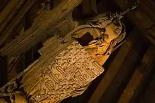 The fabric of the hall is particularly notable for its hammerbeam roof, a form typical of English Gothic architecture which uses horizontal trusses to span large distances. The roof was commissioned for Richard II in 1393 and built by the royal carpenter, Hugh Herland.[2] It is the largest clearspan medieval roof in England, measuring 20.7 by 73.2 metres (68 by 240 ft).[3][4] At the same time the rest of the hall was remodelled by the master mason Henry Yevele.[5] The renovations include eighty-three unique depictions of Richard's favourite heraldic badge, a resting chained white hart.[6]