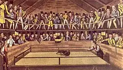 The Westminster Pit was located on Duck Lane, Orchard Street (since renamed St. Matthew's Street), and its dimensions were approximately 20 feet (6.1 m) by 18 feet (5.5 m).[1] The gallery was 3 feet (0.91 m) above the arena and was capable of containing 200 people – or, by report of William Pitt Lennox, "perhaps a greater number of less refractory persons, for the common run of spectators were so obstreperous and so agitated by various emotions, according to the amount of bets depending, and the various turns of the conflict, that a decent orderly person would feel himself much incommoded by a considerably less number."[1]