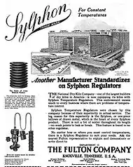 Fulton quickly realized that his invention could be used as a bellows, and thus would have numerous industrial uses. In 1904, he left the Weather Bureau, and with financial backing from businessman John Scruggs Brown, he launched the Fulton Company to market sylphon-based products.[5] One of the company's first successful products was a damper regulator for boilers that used a sylphon to automatically adjust the damper position as the temperature changed.[5] The earliest automobile thermostats used sylphons for actuation.[5] By 1940, over 50 million sylphons were in daily use the United States alone.[6]