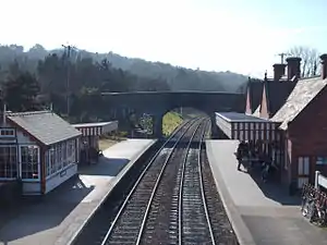 Weybourne railway station is about 1,000 yards (910 m) from the village centre, signposted from the coast road opposite the church. The main station was built in 1900; other structures of the appropriate era, such as the signal box, waiting room and footbridge have been imported from other locations. On the closure of the line, British Rail lifted the track and rased the station, apart from the main station building. It was used as the location for the filming of the Dad's Army episode, "The Royal Train" and is frequently used by film-makers and artists. On the station, there is a small shop, buffet and picnic area. At weekends, there is a bookshop selling a wide range of old railway books and magazines, railway videos and CDs commemorating times past.