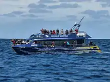 The dominant organisation in Kaikōura's whale watching industry is Whale Watch Kaikōura, which is run as a charitable organisation. It takes around 100,000 visitors out by boat per annum, and has an annual turnover of NZ$10m.[5] Whale Watch Kaikōura began operating in 1987 with a 6 metres (20 ft) boat.[4] Whale watching is also done by air, and the Kaikoura Aerodrome is mainly used for whale spotting tourist flights by Wings over Whales and Air Kaikoura – Kaikoura Aero Club.