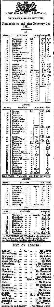 A record dated 27 April 1878 said an engine derailed at facing points at Havelock station on the Wanganui-Patea railway.[4] A Fairlie locomotive was derailed that day.[14] The station may have opened when trains started running on the Wanganui Town Branch to Turakina on 21 January 1878, but Havelock was not shown in the timetable.[15] A record indicates Havelock closed in 1881;[16] St John's was first shown in the timetable from 1 February 1881, with two trains a day to both Palmerston North and Waverley.[17]